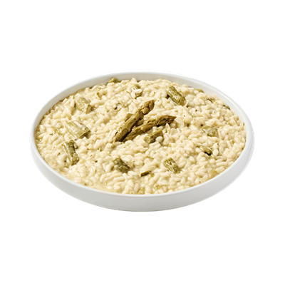 Riso carnaroli, panna, Trentingrana, edamer, burro, asparagi verdi, cipolla, brodo vegetale, fondo bruno, cipolla e vino bianco