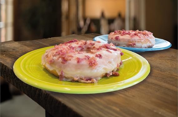 Cuocere le fette di bacon in una padella senza aggiungere altri grassi finché non sono croccanti. Lasciare intiepidire su un piatto coperto con carta da cucina e sbriciolare con le mani. Mescolare lo zucchero a velo con 2 cucchiai di acqua e aggiungere altra acqua fino a ottenere una glassa densa e uniforme. Immergere le ciambelle nella glassa e decorare con le briciole di bacon.