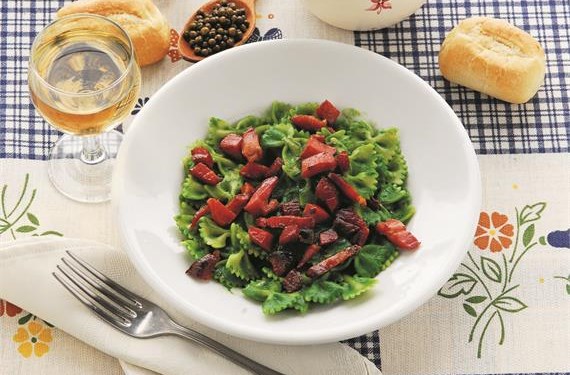 Mondare lo scalogno e tritarlo finemente. Lavare e tagliare gli spinaci e privare del germoglio interno l’aglio. Scaldare un filo d’olio in padella, aggiungere aglio e scalogno e far cuocere. Unire al soffritto gli spinaci, salarli e farli cuocere una decina di minuti senza coperchio. Lasciarli raffreddare - se necessario scolando il fondo di cottura in eccesso - e frullarli con ricotta, sale e pepe, aggiungendo a filo l’olio per ottenere una salsa densa. Lessare la pasta in abbondante acqua salata e nel frattempo rosolare il prosciutto crudo in padella con un filo d’olio. Scolare le farfalle al dente e condire con il pesto, usando poca acqua di cottura per amalgamare meglio in caso di bisogno. Servire con i dadini di prosciutto crudo.