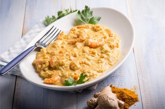 ben cotto alzare leggermente la fiamma e aggiungere curry e zenzero. Tostare per un paio di minuti finché le spezie non sprigionano il loro profumo. Unire al soffritto il concentrato di pomodoro e lasciare insaporire. Trasferire in padella i gamberi e rosolare per 5 minuti. Bagnare con il latte di cocco e far cuocere per circa 10 minuti a fiamma bassa. Nel frattempo, sciogliere l’amido di mais in una tazzina da caffè riempita con latte di cocco e incorporare all’intingolo. Proseguire la cottura fino a ottenere la densità desiderata e servire.