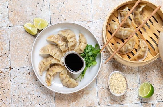 Impastare la farina con l’acqua bollente fino a ottenere un panetto omogeneo. Coprire con pellicola per alimenti e lasciare riposare per 30 minuti. Nel frattempo, staccare 4 foglie di verza, lavarle e tenerle da parte. Tagliare a listarelle la verza rimasta, lavare e asciugare. Affettare il cipollotto precedentemente mondato. Sciacquare i gamberi sotto acqua fredda corrente e tritare. In una ciotola unire i gamberi, il cipollotto, poca verza alla volta, la fecola, l’olio di sesamo, salsa di soia e succo di lime. Mescolare per ottenere un composto uniforme.