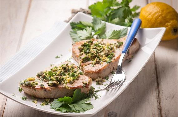 Immergere i capperi in una ciotolina di acqua fredda e lasciare a bagno per circa 10 minuti. Nel frattempo, lavare il limone e prelevare la scorza con un pelapatate, facendo attenzione a prelevare solo la parte gialla per evitare il sapore amaro della parte bianca. Lavare il prezzemolo e asciugare. Sciacquare il tonno e tamponare con carta da cucina. Preparare il condimento: prelevare i capperi dall’acqua, passarli sotto abbondante acqua corrente fredda e adagiarli su un tagliere. Tritare insieme al prezzemolo e alla scorza di limone. Trasferire il tutto in una ciotola e unire olio, pepe e succo di limone. Ungere leggermente una piastra o una padella antiaderente e cuocere il tonno 5 minuti per lato. Eventualmente piastrare solo due tranci alla volta per non riempire troppo la padella. Trasferire su un piatto e servire con il condimento preparato.