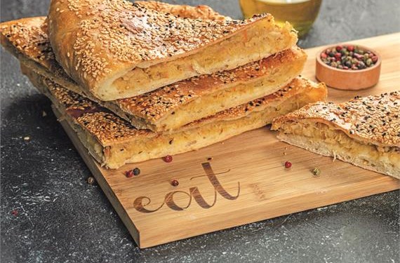 Mescolare in una ciotola farina, olio e zucchero e aggiungere poco a poco l’acqua tiepida, il sale e il lievito. Lavorare l’impasto fino a ottenere un panetto liscio e omogeneo. Coprire con la pellicola e lasciare lievitare fino al raddoppio in un luogo tiepido (per circa un’ora). Nel frattempo, preparare il ripieno. Lavare la patata e lessarla in acqua bollente salata finché non è morbida, scolarla, pelarla, schiacciarla con una forchetta, condirla con sale, pepe e olio e lasciarla raffreddare. Affettare sottilmente il cavolo e rosolarlo in padella con aglio, olio e la cipolla. Quando inizia ad appassire, bagnarlo con l’aceto diluito in 2-3 cucchiai di acqua e condirlo con il cumino. Lasciare evaporare i liquidi e cuocere il cavolo a fuoco basso finché non è morbido. Condire con sale e pepe, far raffreddare e unirlo alla patata schiacciata. Stendere l’impasto e formare un rettangolo. Farcire e richiudere su se stesso, premendo bene i bordi per fare aderire i due lembi, e trasferirlo su una teglia foderata di carta da forno. Spennellare con l’uovo sbattuto e cospargere con i semi di sesamo. Cuocere nel forno ventilato già caldo a 190 gradi per 15 minuti circa.
