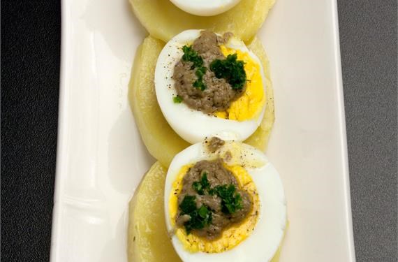 fetta mezzo uovo sodo, condire con bagna cauda, olio, pepe e prezzemolo e servire.